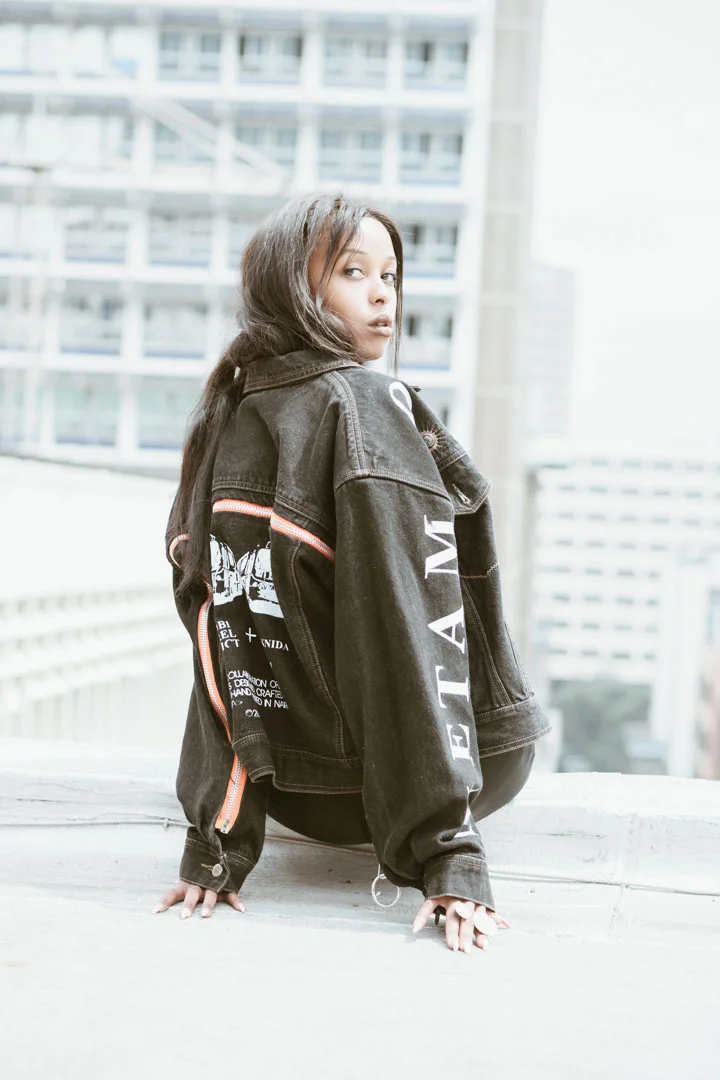 Anne Mwaraua in Non-TelevisedTM Limited Edition Charcoal Black Unzipped Denim Jacket