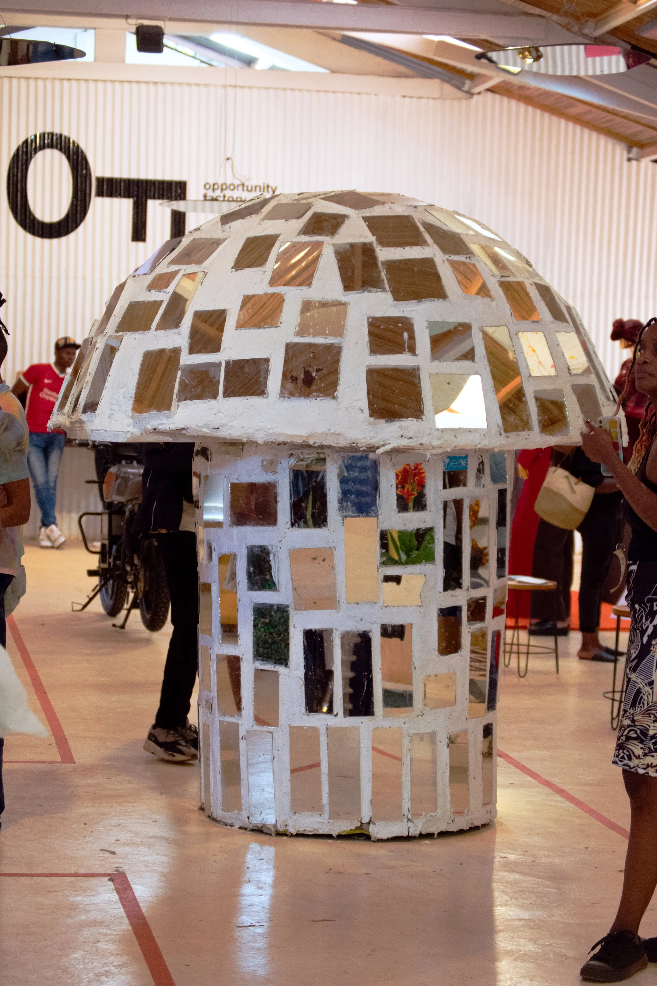 Moving forward, your eyes are drawn to the sleek Roam Electric motorcycle. A symbol of innovation and sustainable design. Nearby, a giant mushroom installation stands tall, titled “High on Shrooms” by Vinette for Kilibasi Design Studio. Its surface was adorned with countless mirrors reflecting light and creating a mesmerizing play of reflections. Adjacent to this, The Africa Textile exhibition booth catches your attention with designs crafted from recycled denim materials, each piece telling a story of sustainability and creativity.