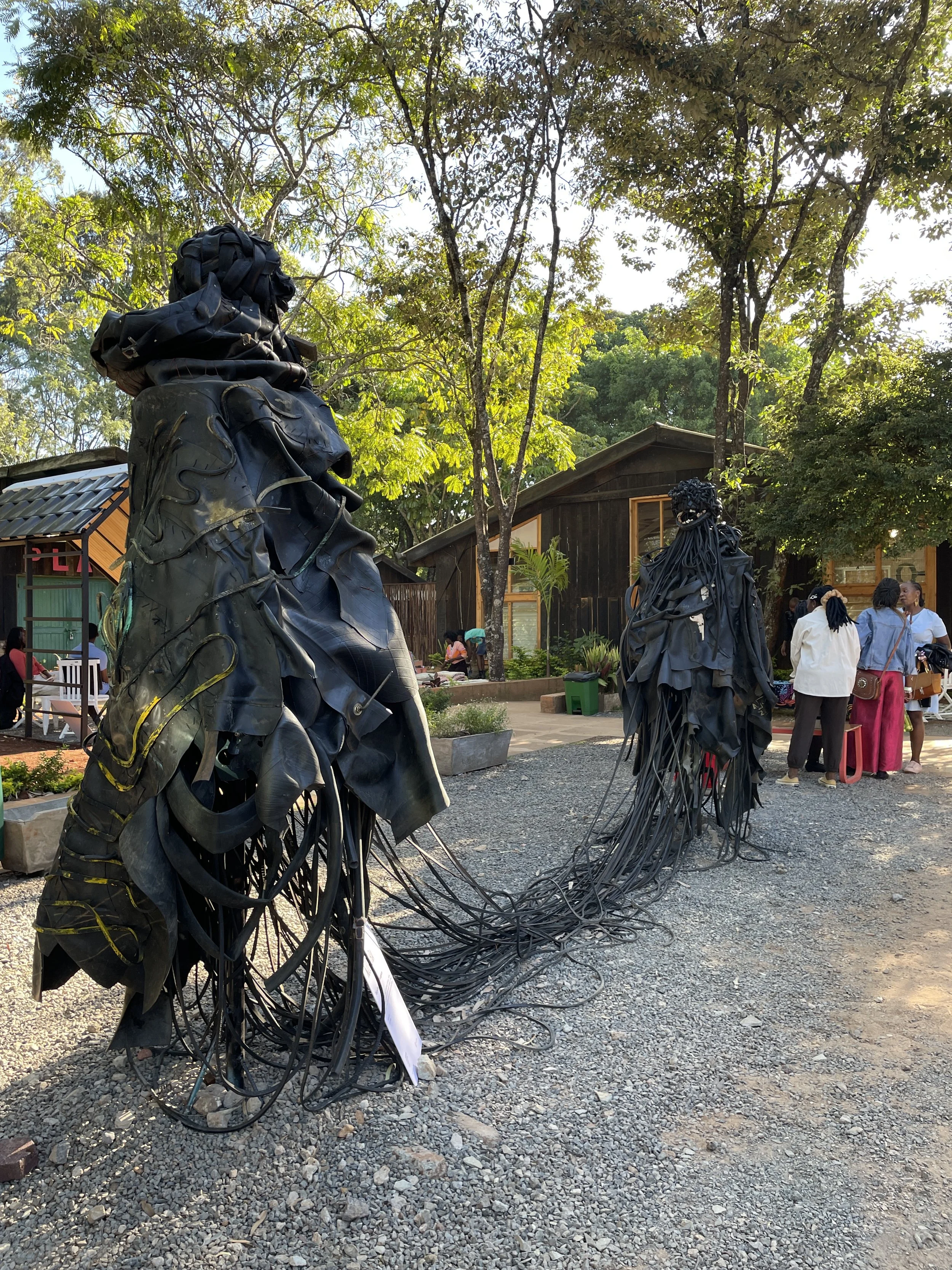 Continuing on the exploration of Nairobi Design Week's diverse offerings, the outside space of the Opportunity Factory unveils a myriad of captivating exhibitions and installations. One striking piece that demands attention is a monumental sculpture by Njogu Kuria, resembling African masquerades, meticulously crafted from recycled rubber sourced from tires. Here, the power of assemblage techniques takes center stage, blending handcraft with industrial technology in a mesmerizing display of artistry.