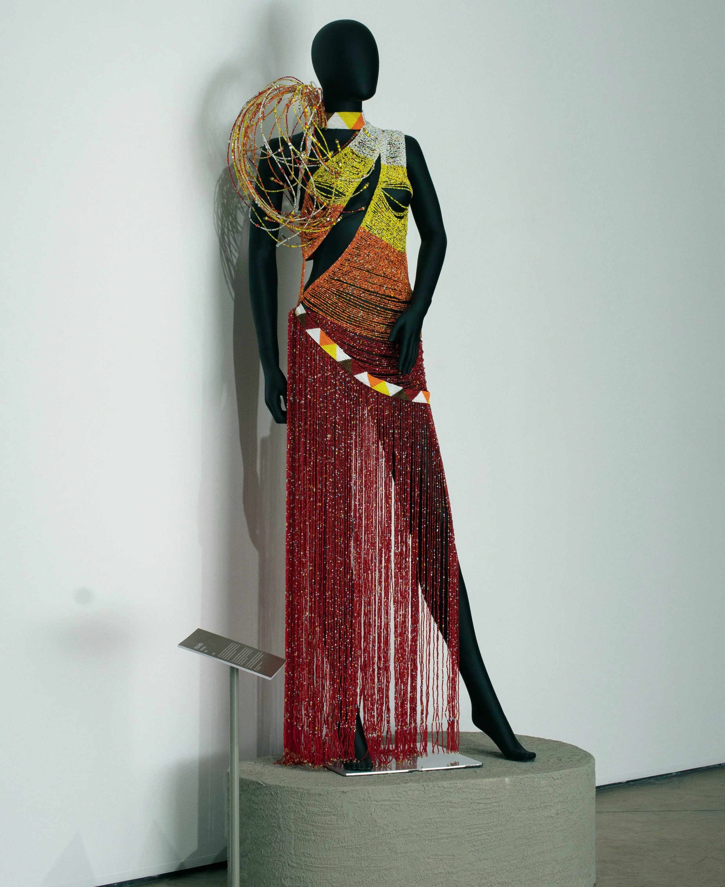 We started by looking at materials and material expression exemplified by the works of artist Johanna Bramble. Bramble, alongside Dickens Otieno and Hisi Studio, employs textiles as their primary medium. Her innovative use of materials like Abaca (banana fiber), Raphia fiber, and traditional cotton treatments, reflects an ancestral approach to cloth-making that transcends conventional boundaries. Additionally, Otieno's unconventional use of shredded aluminum cans woven together challenges preconceived notions of materiality and craftsmanship. In addition, the exhibition spotlighted a beaded dress by Patricia Mbela, crafted using the lost beading style of the Taita community in Kenya. This particular style of beadwork was decimated under British colonial rule in Kenya, as it was unjustly labeled as witchcraft, a tragic consequence of colonial prejudices.